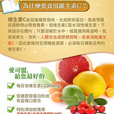 成份:維生素C, 微晶纖維素, 羥丙基甲基纖維素, 玫瑰果, 植物性硬脂酸, 交聯羧甲基纖維素鈉, 二氧化矽, 植物性硬脂酸鎂, 二氧化鈦, 麥芽糊精, 食用紅色40號, 食用藍色2號, 食用黃色5號。